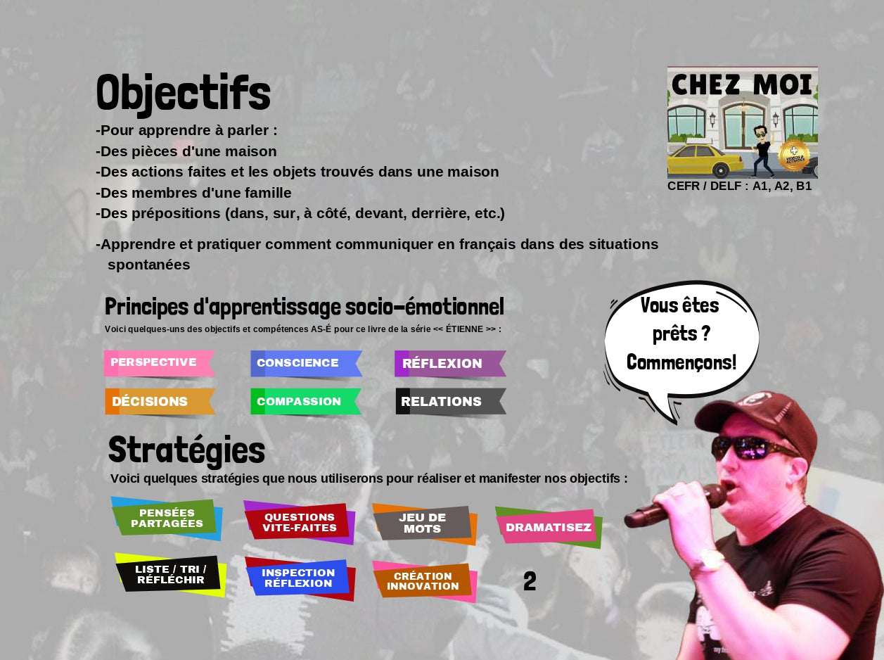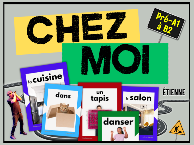 Découvrez les lecteurs français de l'interprète primé ÉTIENNE. Il écrit des chansons et parcourt le monde dans des théâtres et des arènes à guichets fermés. Lisez maintenant les romans graphiques français qui aident les élèves à apprendre le français de manière interactive. Chaque livre est accompagné de questions et de codes QR vers des vidéos musicales et des activités. CHEZ MOI emmène les élèves dans la maison d'ÉTIENNE pour tout savoir sur les pièces et objets typiques de la maison.