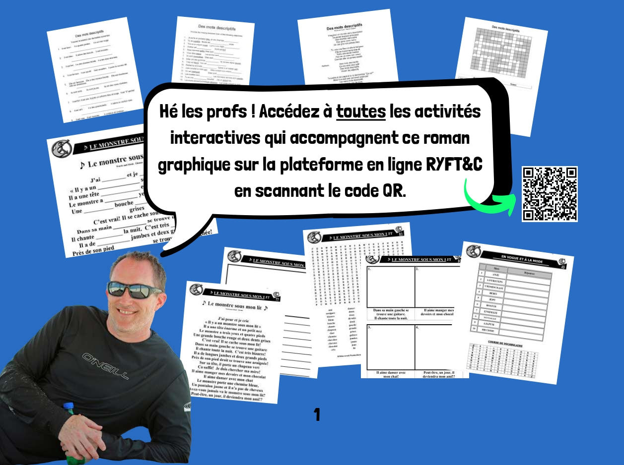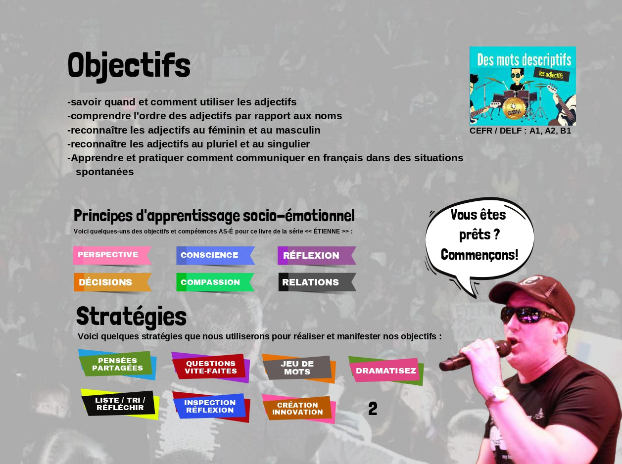 Découvrez les lecteurs français de l'interprète primé ÉTIENNE. Il écrit des chansons et parcourt le monde dans des théâtres et des arènes à guichets fermés. Lisez maintenant les romans graphiques français qui aident les élèves à apprendre le français de manière interactive. Chaque livre est accompagné de questions et de codes QR vers des vidéos musicales et des activités. Deux leçons dans un livre ! Tout d'abord, nous apprenons tout sur l'importance des mots descriptifs. Ensuite, nous apprenons les adjectifs et leur place dans une phrase. On apprend des trucs pour savoir les manipuler dans des phrases.