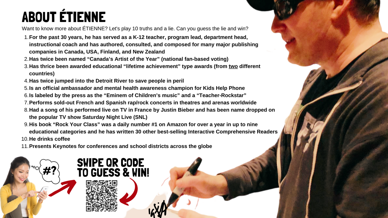 Play 10 truths and a lie. Learn about what ÉTIENNE has been doing the past 30+ years. Find the lie, hit the submit button, and get a free download of the best-seller THE READERS' PLAYBOOK.