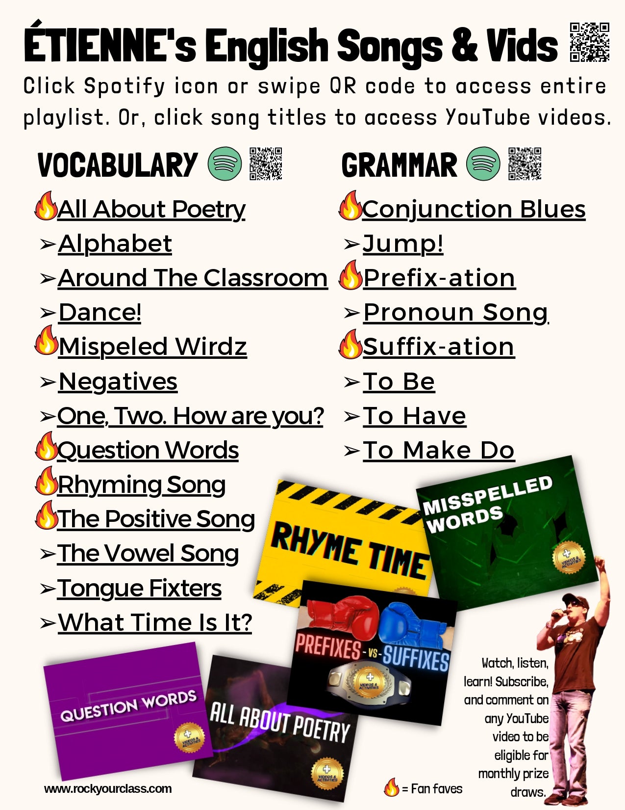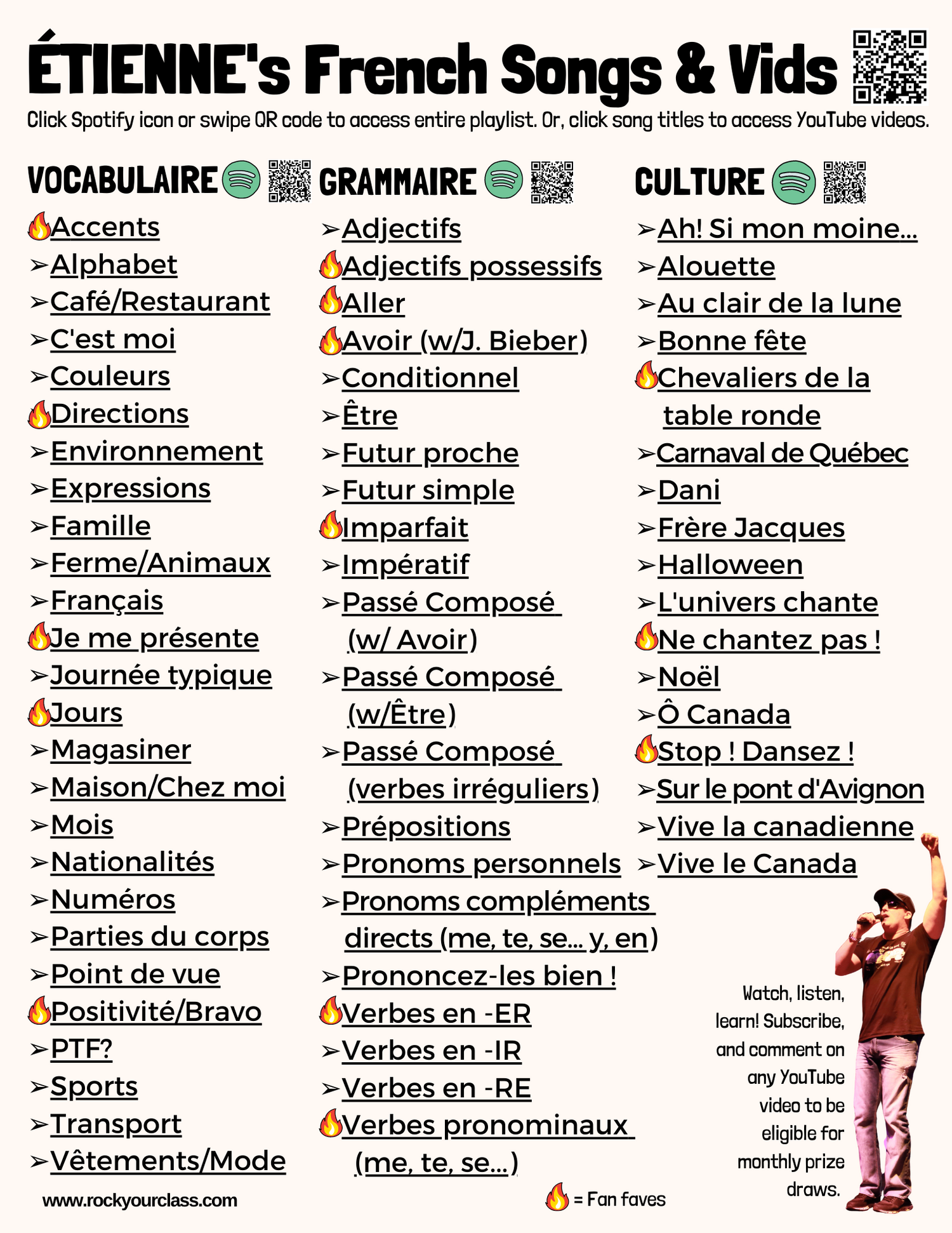Download and share this PDF with hyperlinked FRENCH song/video titles and QR codes to Spotify and YouTube playlists.