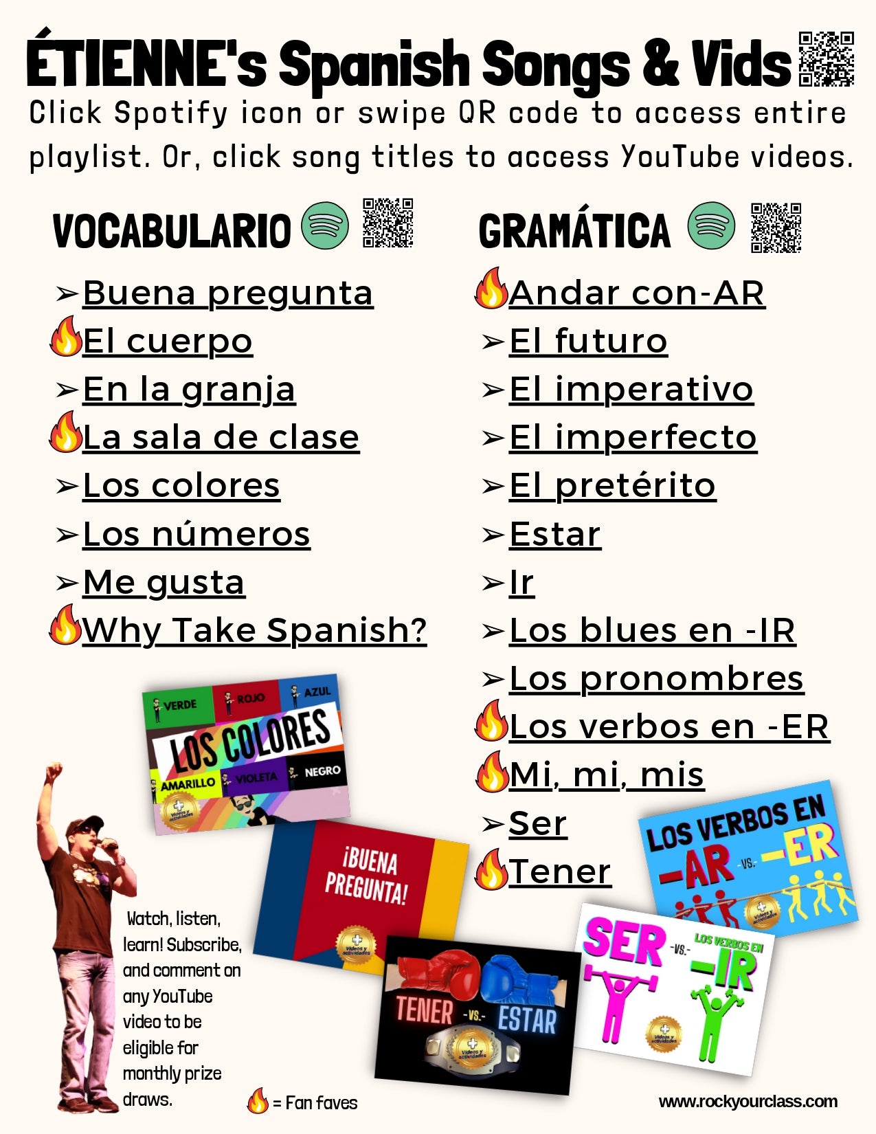 Download and share this PDF with hyperlinked SPANISH song/video titles and QR codes to Spotify and YouTube playlists.