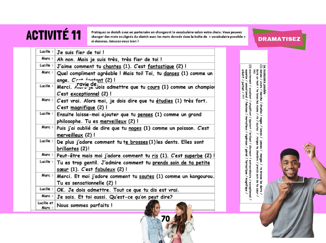 What an engaging way to practice French adjectives and positive affirmations! Students have opportunities versions of « Bravo! » in French and can put them into practice immediately with every game or activity they do. I love the community-building idea on page 81 where students write positive messages on sticky notes and place them around the school or their home. There are also examples of different negative expressions in this module, giving students added practice with that grammar concept. It’s great that the options for final projects are provided right at the start (« beginning with the end in mind ») and that there are images of the PDF activity sheets that come with the learning platform. (Follow the instructions on the main Amazon product page for how to obtain forever access to the learning platform.)