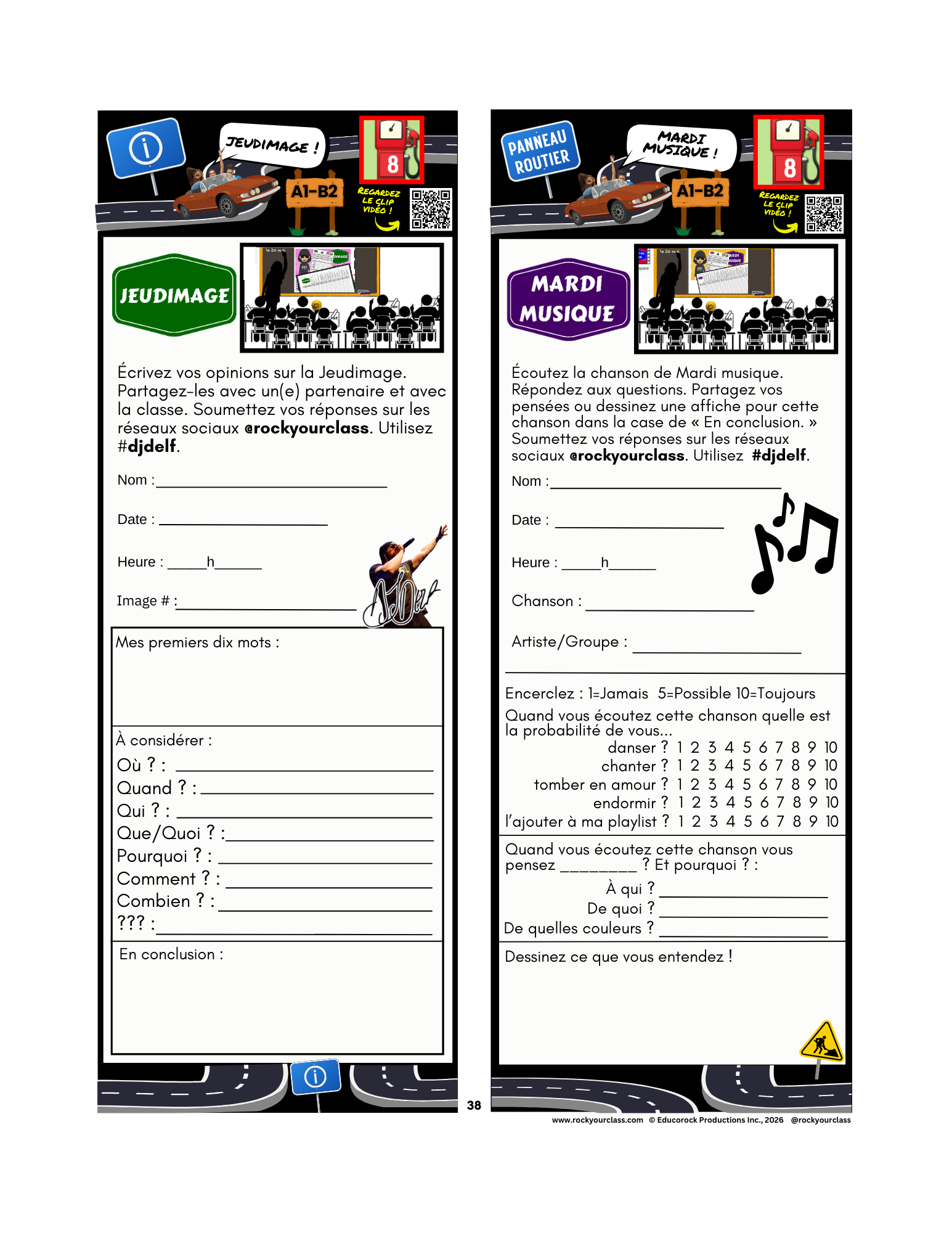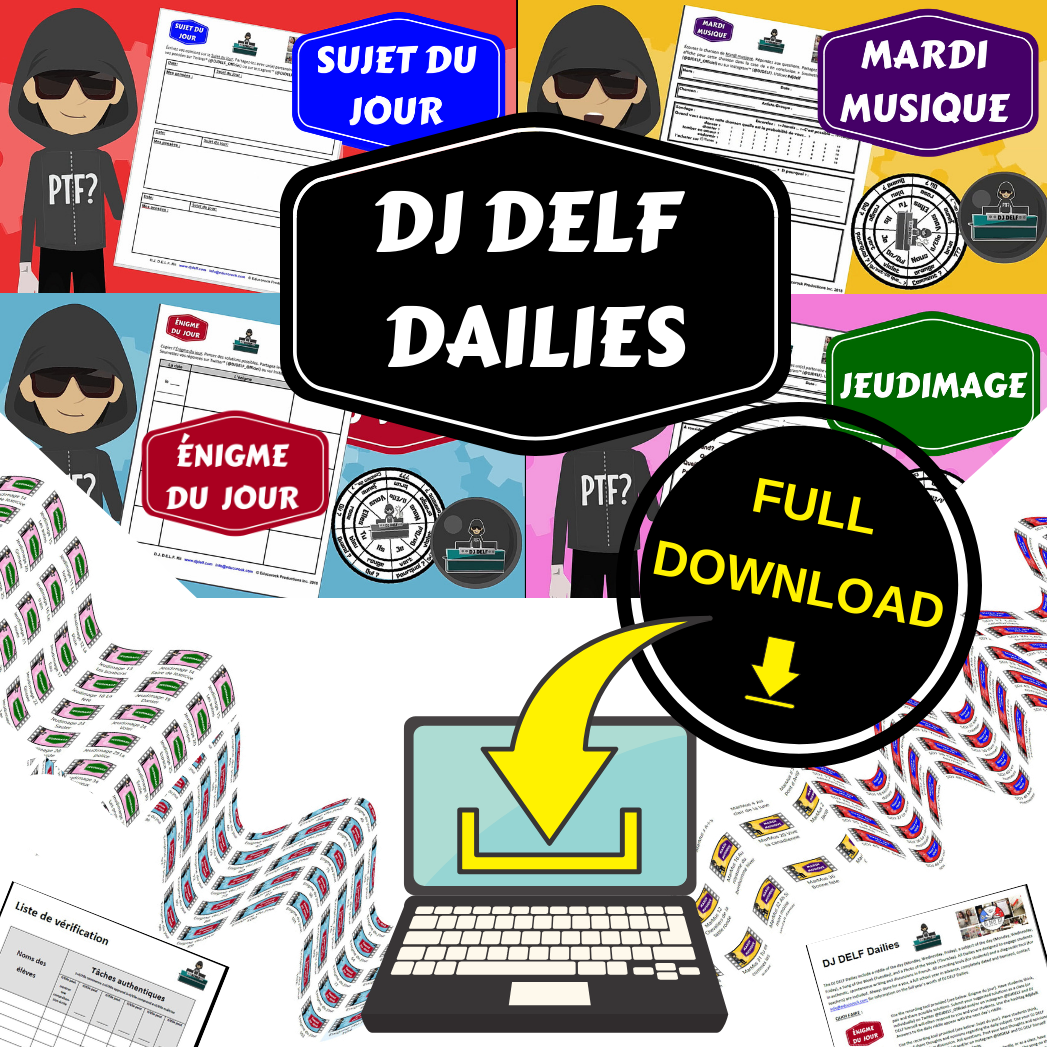 Get all 310 videos via instant MP4 DOWNLOAD on the DJ DELF DAILIES online platform and by shared Google Drive. This package includes 115 "Sujet du jour," 115 "Énigme du jour," 40 "Jeudimage" and 40 "Mardi musique" videos, the complete DJ DELF Dailies Activity Tools and Assessment Guide (pdf) and the introductory video.