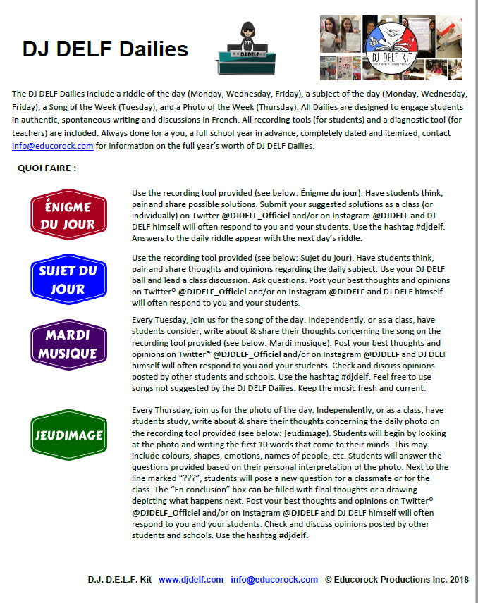 ÉTIENNE says that the DJ DELF DAILIES are the best resource he has ever used in his career! That says a lot! Click the live link below and enroll in the DJ DELF Dailies FREE mini-course to experience the videos, activity tools and assessment guide package for French bell work and conversation starters.