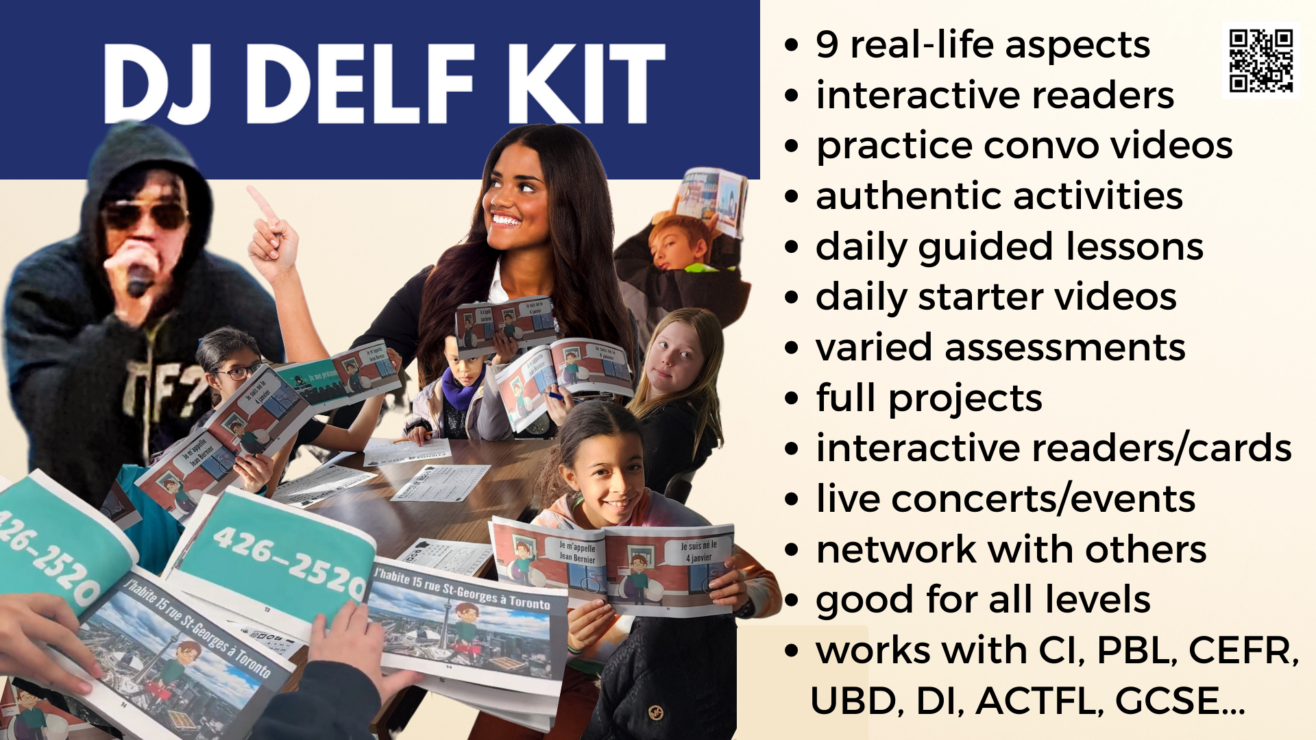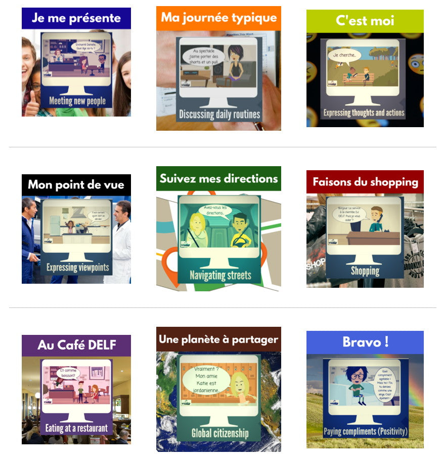 | Au Café D.E.L.F. | A1, A2, B1 | Step into DJ DELF's personal café where you can order as much as you want off the menu! Students gain the tools necessary to maintain interaction at a restaurant while holding discussions & expressing opinions. |