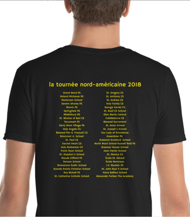 This OFFICIAL Tour concert t-shirt for the ÉTIENNE XXV concert tour featuring Étienne, Nate Vedette, Guy Tariste and Roland Bibeau. Find your school proudly displayed on the back! Thanks for celebrating the French language and culture with us on this Tour!