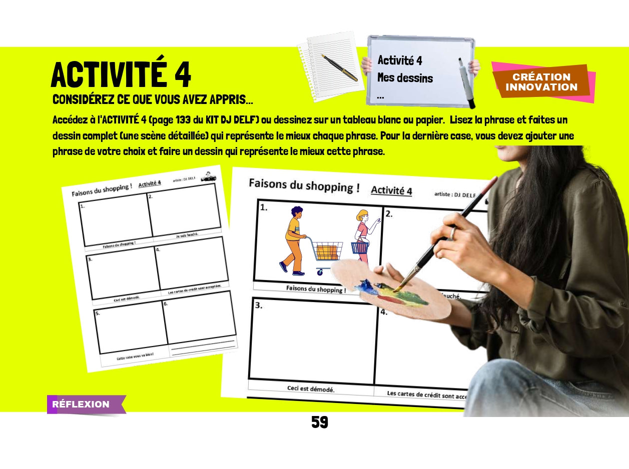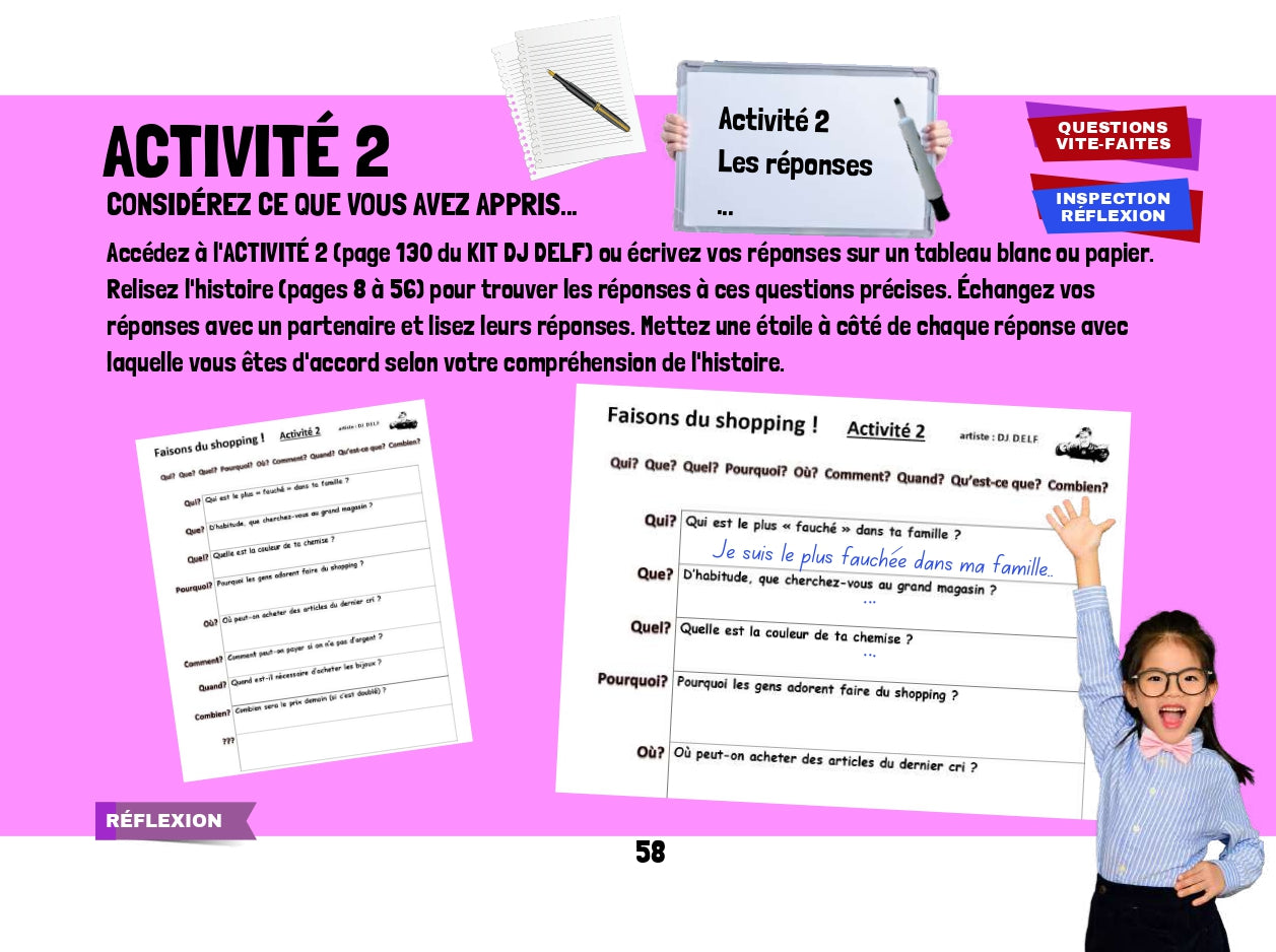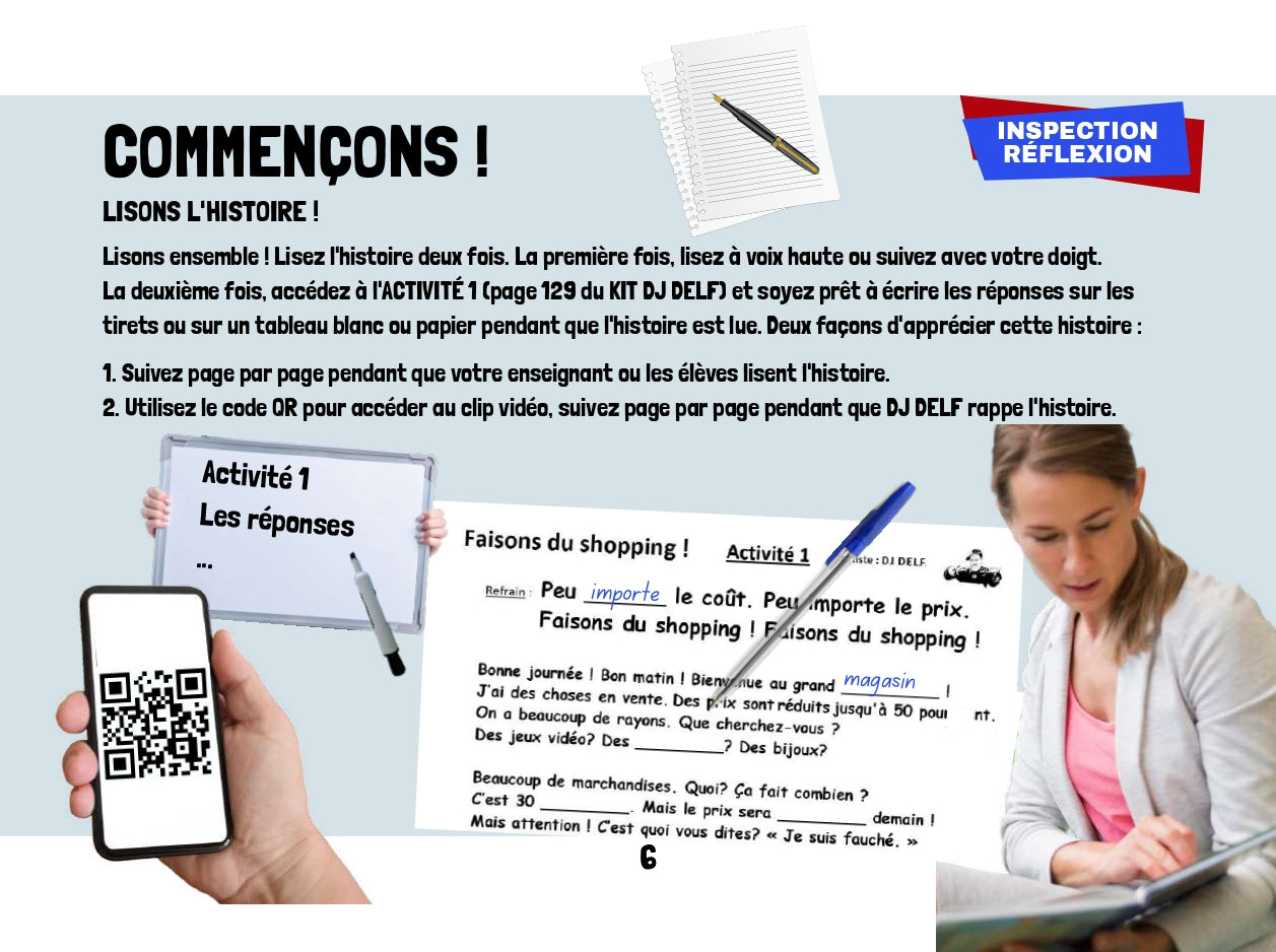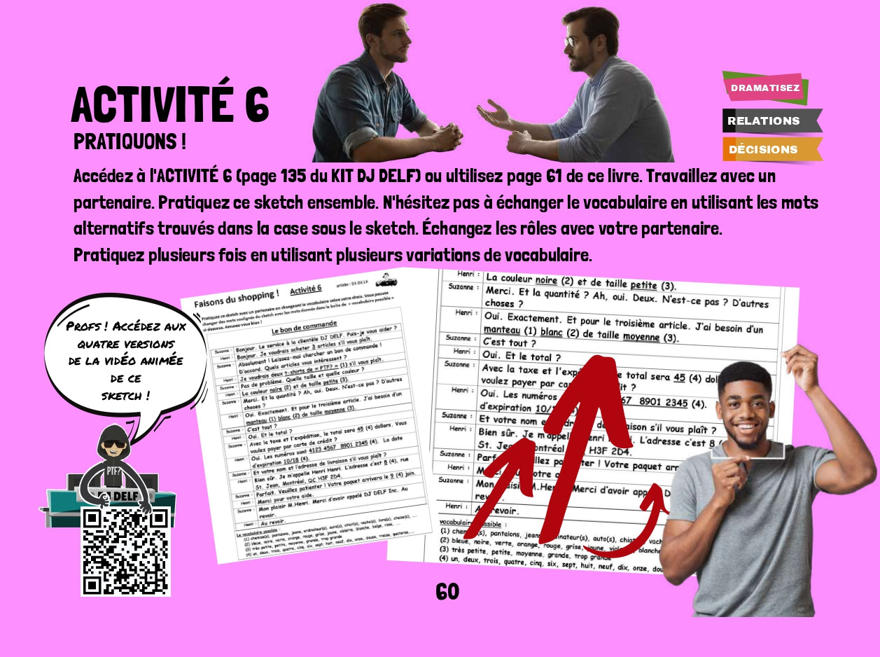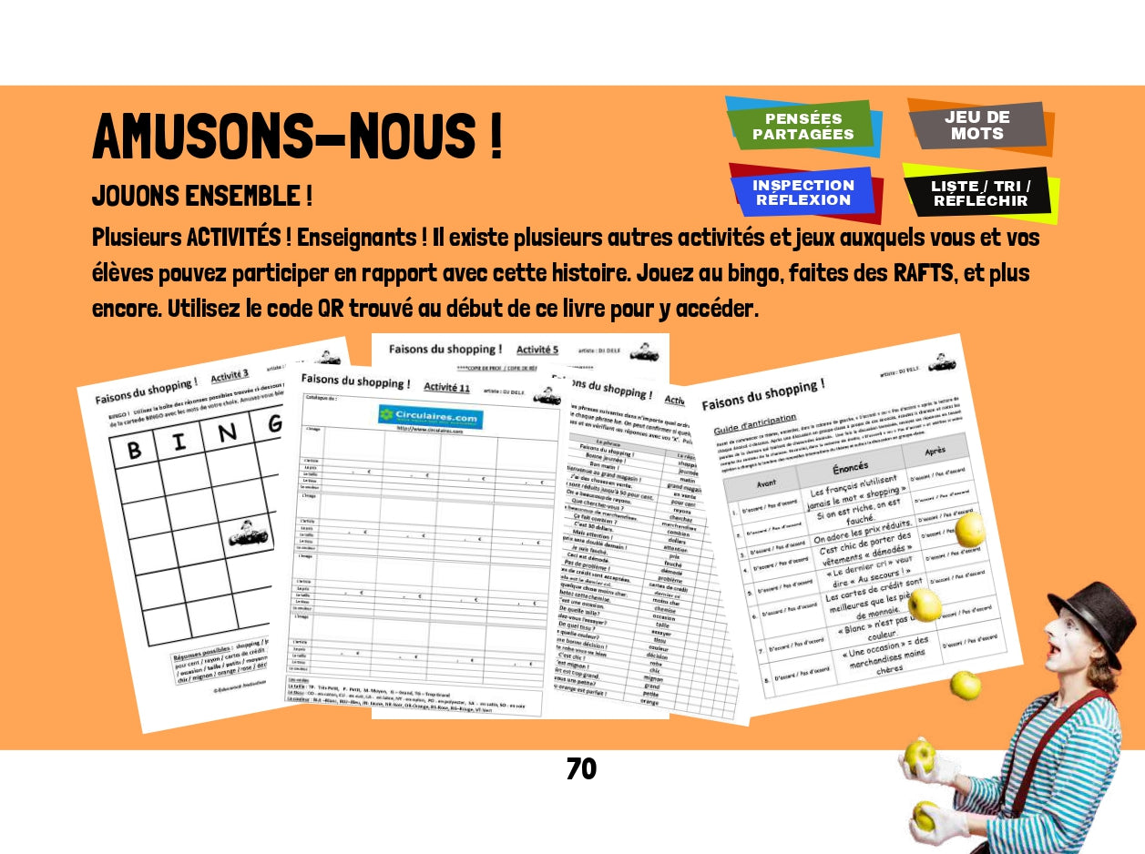 The FAISONS DU SHOPPING interactive comprehensive reader comes with a story, activities, order forms, catalogue pages, videos, a skit, final projects, assessment support, and so much more.