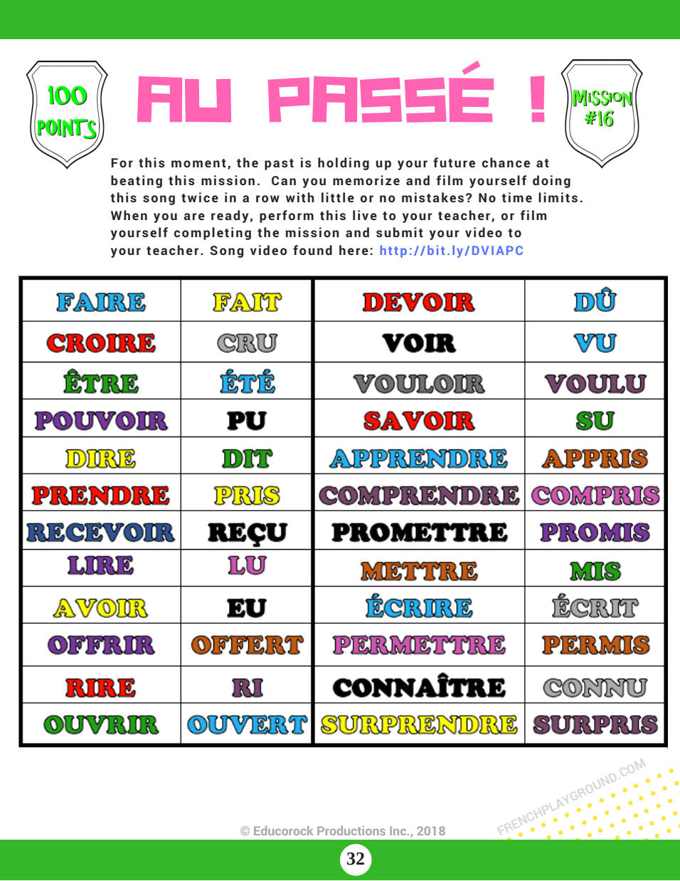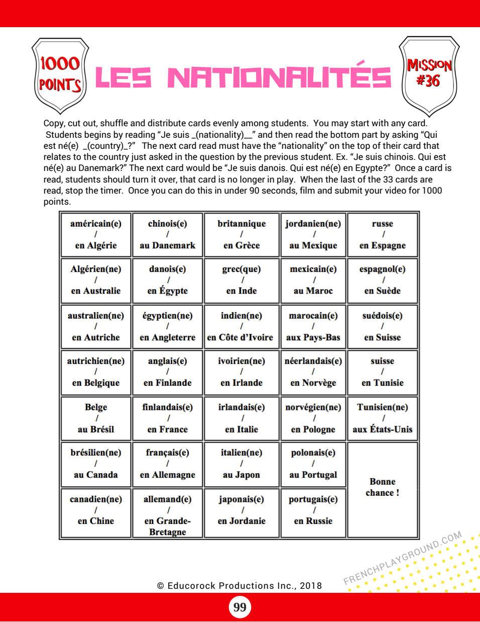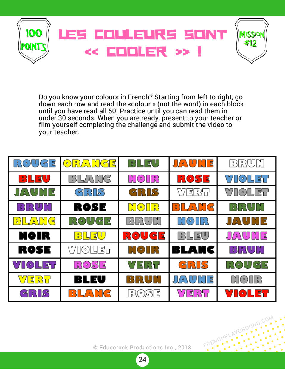 Imagine having 40 French challenges that you can assign your students at school or for homework. Imagine your students immersed in reading, writing, listening and speaking activities at varying levels. The French Playground Missions (110 pages) comes with a guide, activities, and assessment tools.