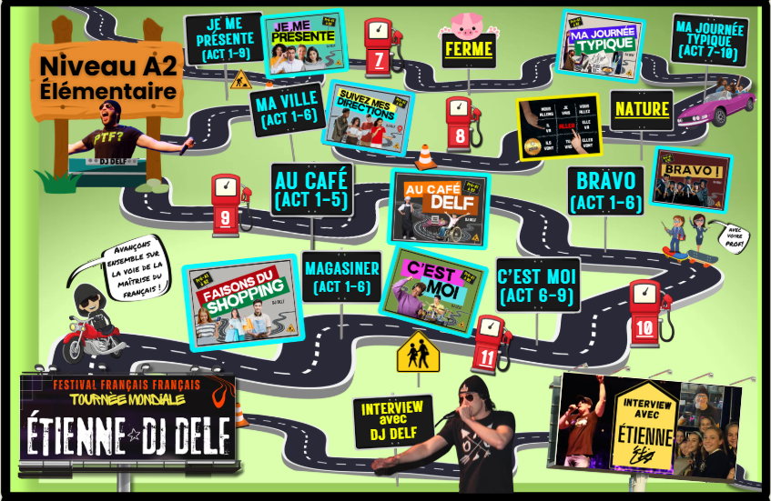 PLEASE NOTE: On each map from A1 through B2, each of the stops are hyperlinked to purchasable, forever access platforms (no subscriptions). From l'ALPHABET to full on French debates and essay writing and everything in between, each individual platform contains songs, stories, videos, sketches (with interchangeable vocabulary), authentic tasks, planning tools, report card comments, assessment package and more! Grab any stop for as low as $9.99! Ask us about bundle package pricing! :)