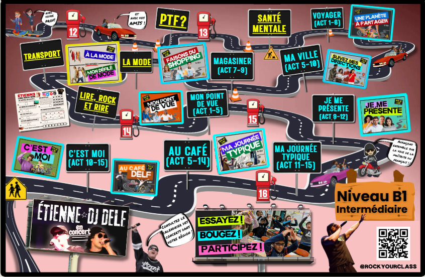 The roadmap & fuel ups are terrific metaphors for the learning journey & occasional grammar stops in French. They correspond to current international proficiency levels of language acquisition. The hyperlinks are easy access to related paid online resources. Making a poster printout is a strong visual for students & parents to track French learning. It shows a sense of progress, direction & it's fun!