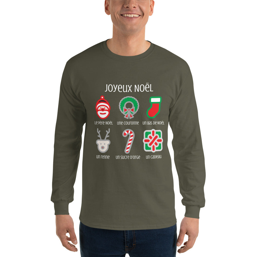 Celebrate Noël with this Christmas dark long sleeve vocabulary shirt. Available in various colors and sizes.