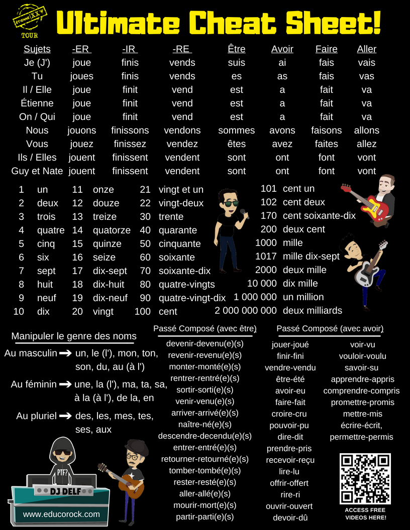 Back: Cheat-sheet study guide. Scan the QR code for instant access to the Educorock YouTube channel and hundreds of French educational videos.