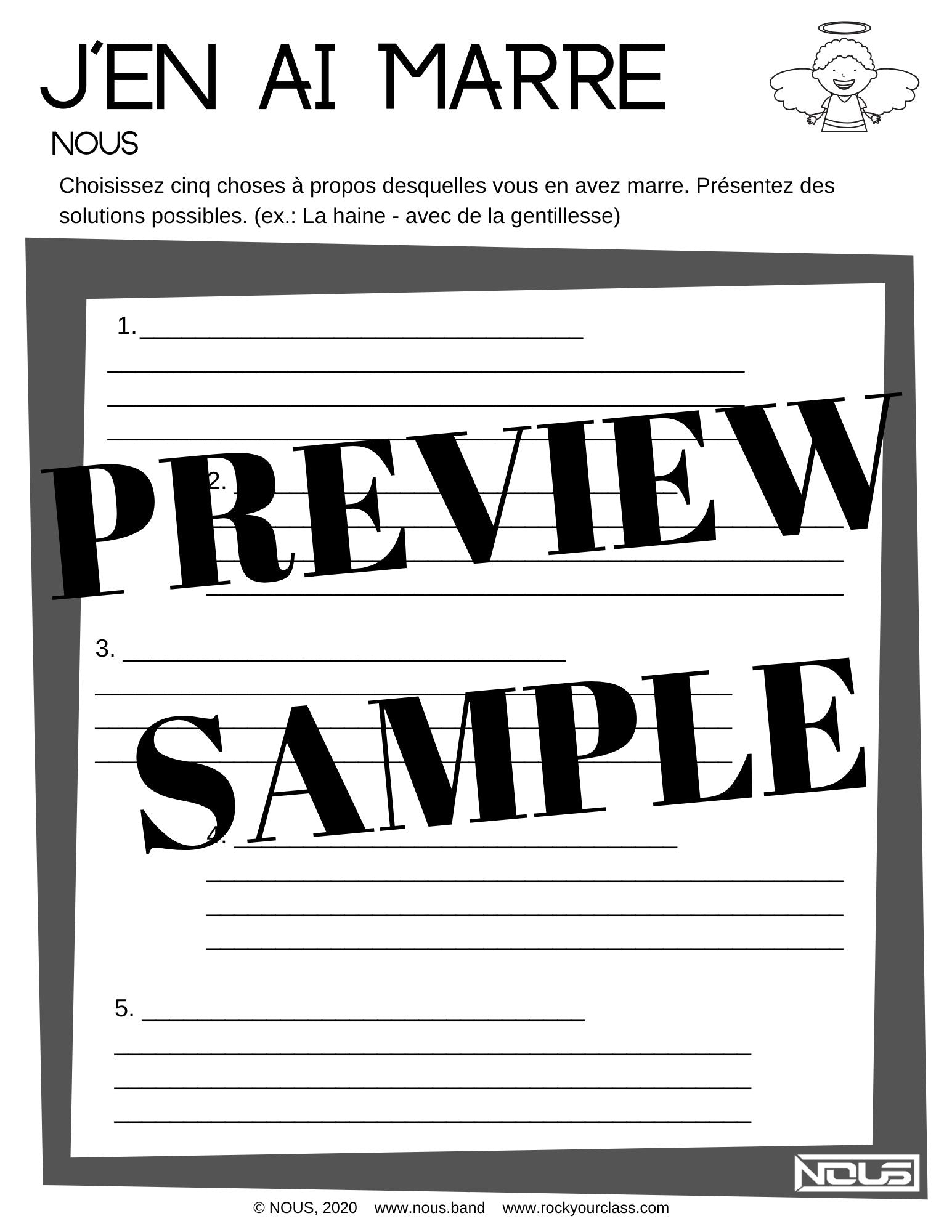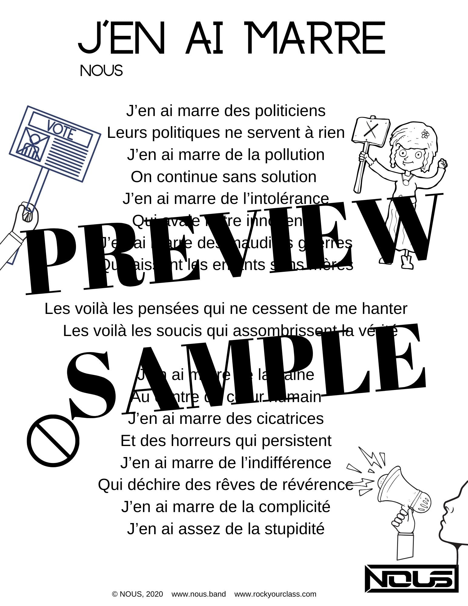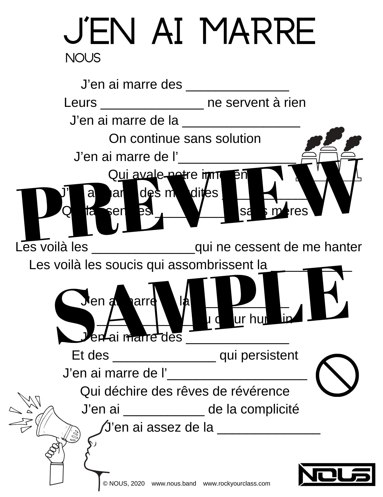 This free download of the "THIS SUCKS!" Complete Lesson Plan Package contains the lyrics and follow-up activities for the music video and song "J'en ai marre" (band: NOUS).
