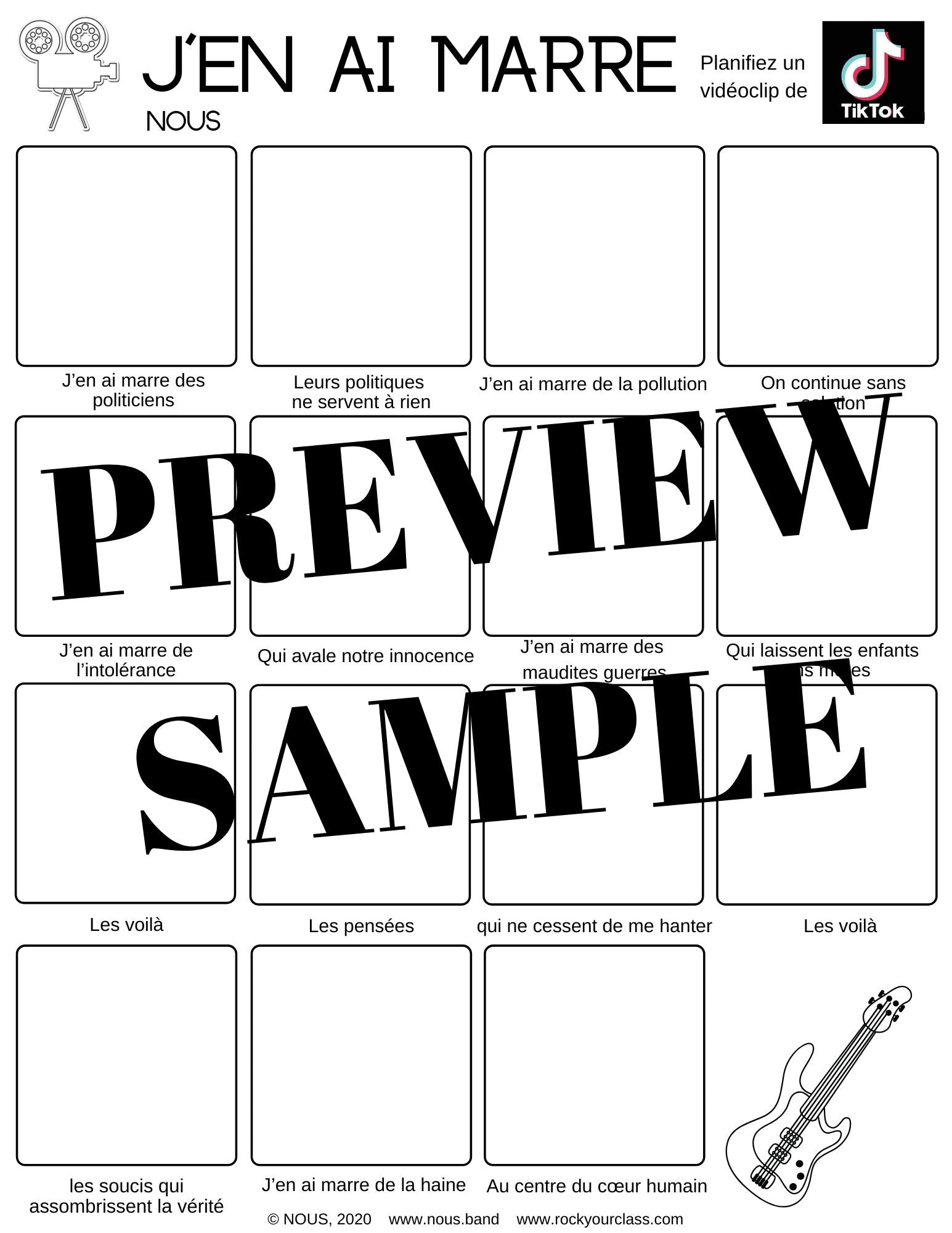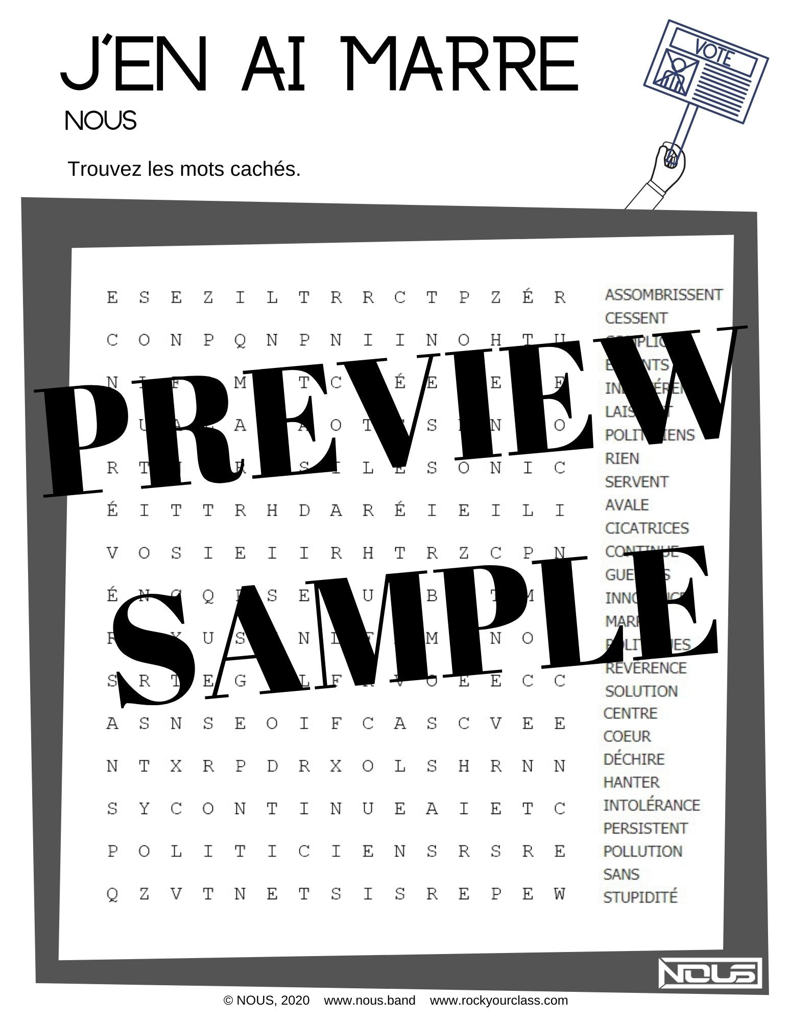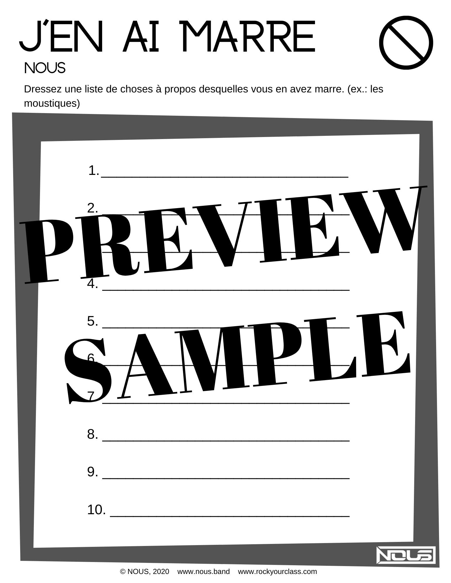 This free download of the "THIS SUCKS!" Complete Lesson Plan Package contains the lyrics and follow-up activities for the music video and song "J'en ai marre" (band: NOUS).