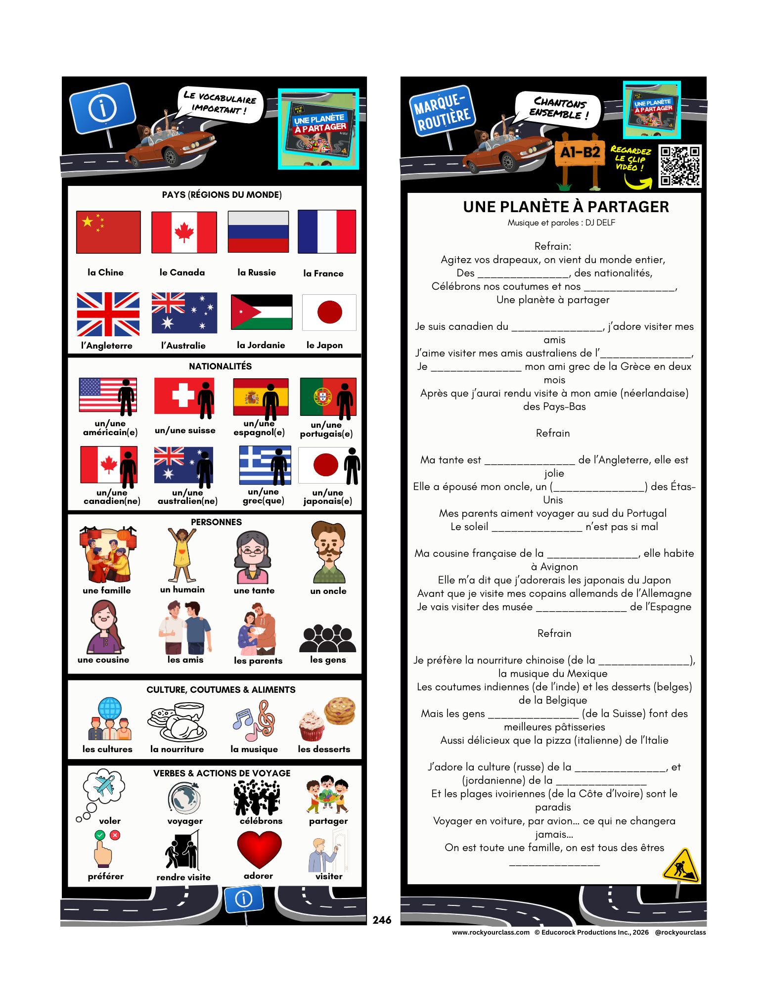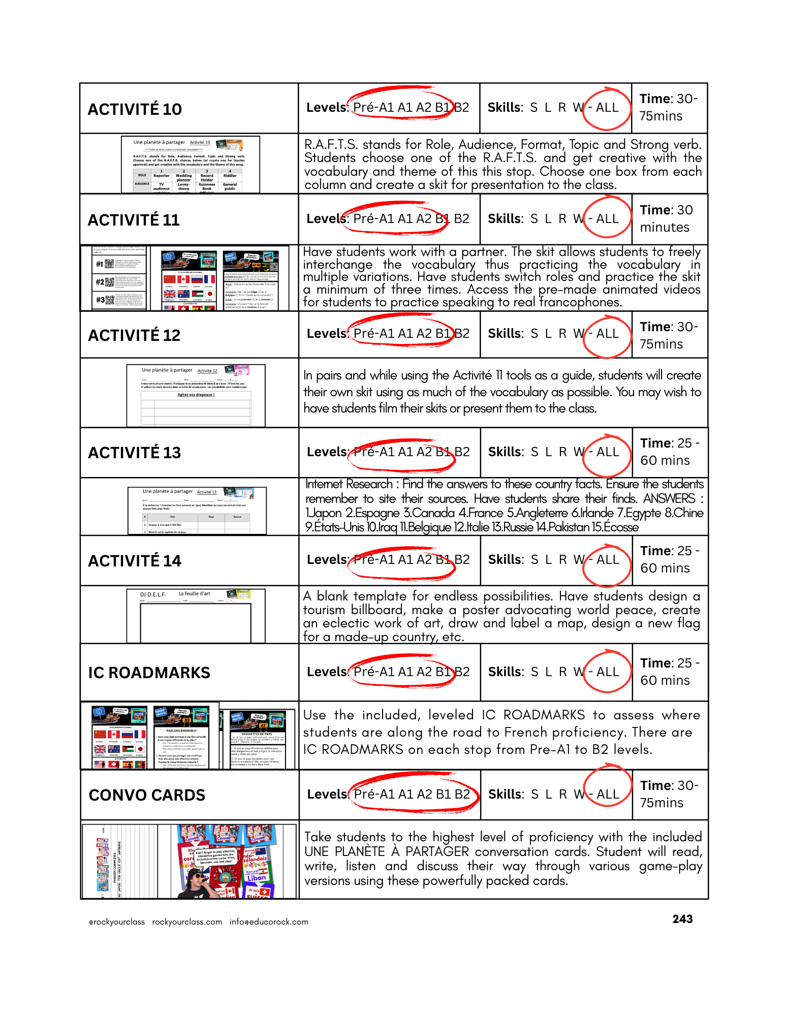 The UNE PLANÈTE À PARTAGER interactive comprehensive reader comes with a story, activities, journal entry organizers, videos, a skit, final projects, assessment support, and so much more.
